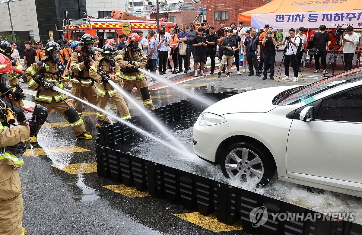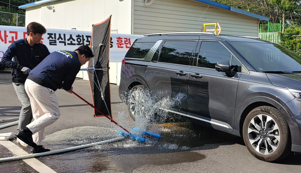 차량 하부에서 고압수를 분사해 배터리 온도를 서서히 낮추는 방식