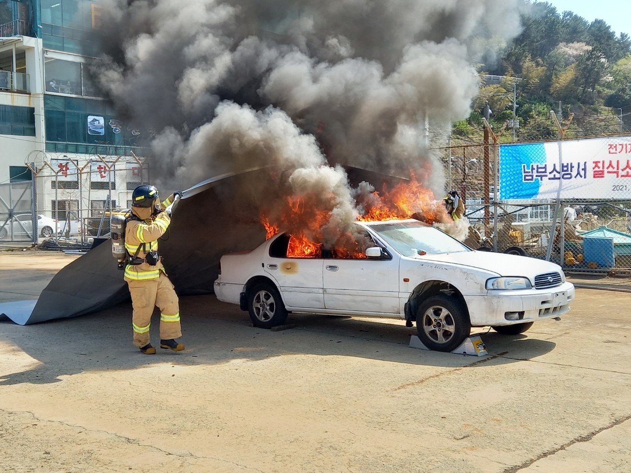 전기차에서 발생한 화염을 외부에서 덮어 산소 유입을 차단하여 열 확산 방지